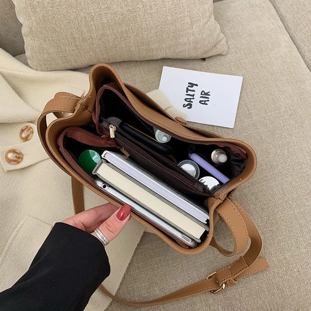 Такая сумка через плечо не намокнет под дождём. Две короткие ручки и одна длинная регулируются. Внутри имеется прорезной кармашек на молнии для ключей, налички и косметики. Снаружи — два кармана для бутылки с водой и зонта. В общее отделение легко поместится даже объёмный контейнер с перекусом.