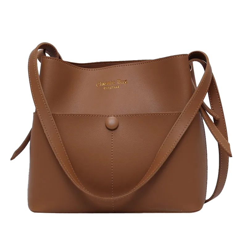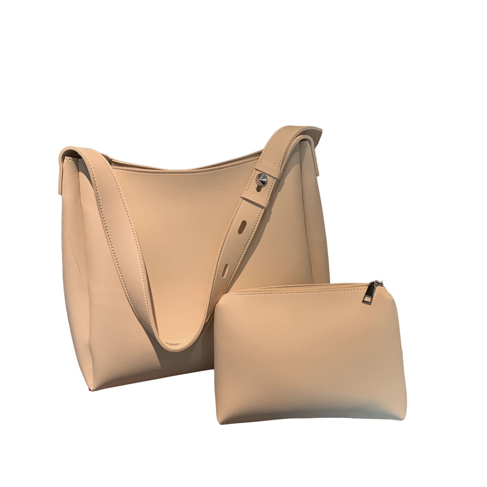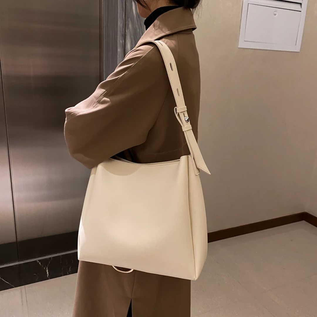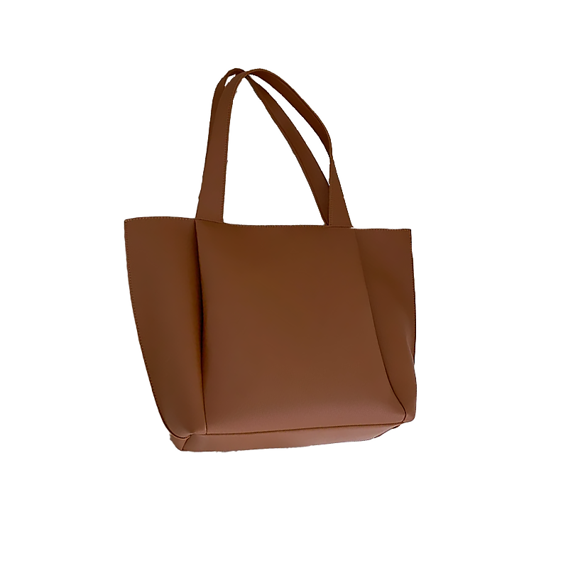 Минималистичный шопер с длинной регулируемой ручкой закрывается на две магнитные кнопки. Внутри одно отделение без карманов, зато в комплекте идёт косметичка — в неё можно сложить всю мелочёвку и взять с собой. Если после работы вы идёте на тренировку, сложите спортивную форму в такой шопер из кожи, чтобы не портить образ спортивной сумкой.