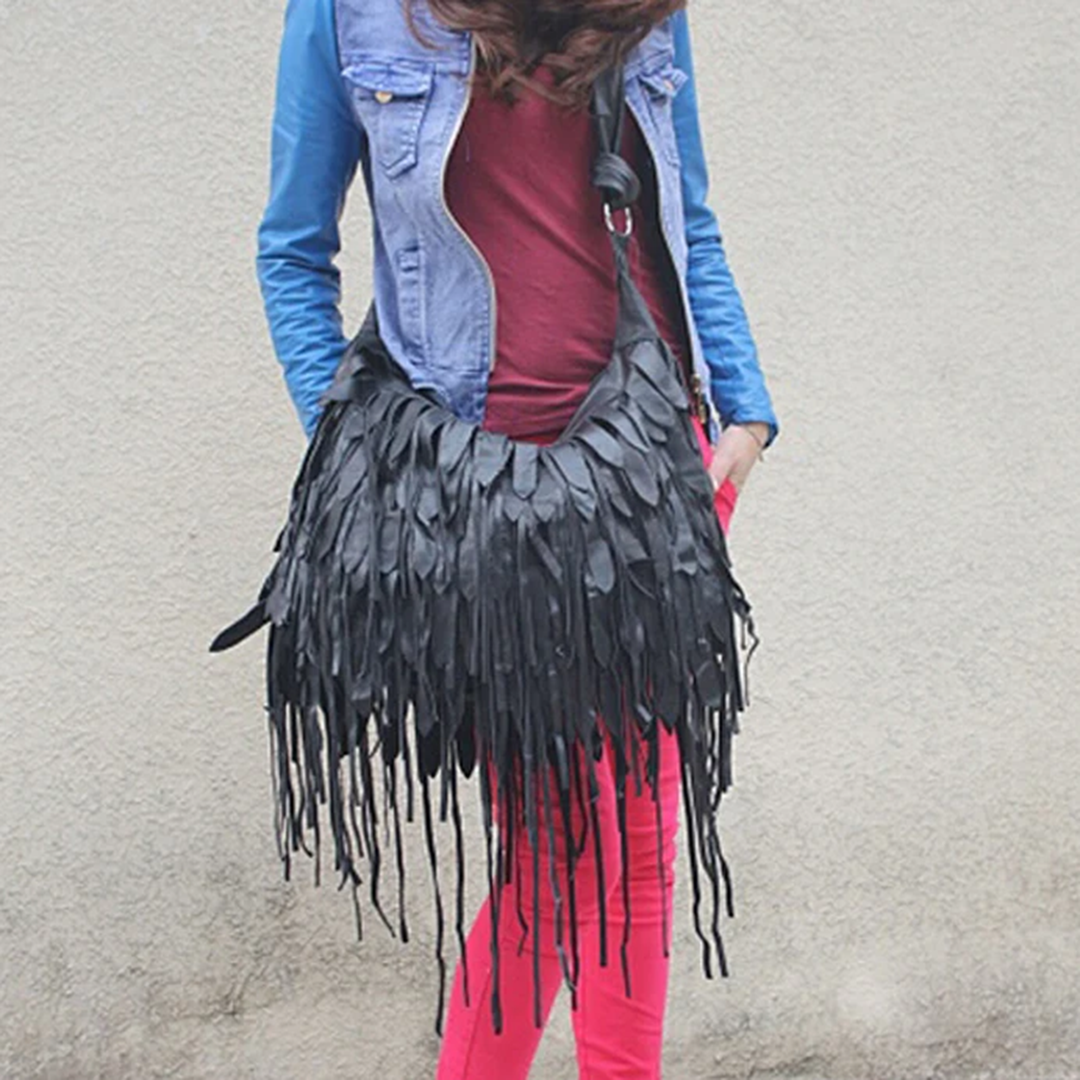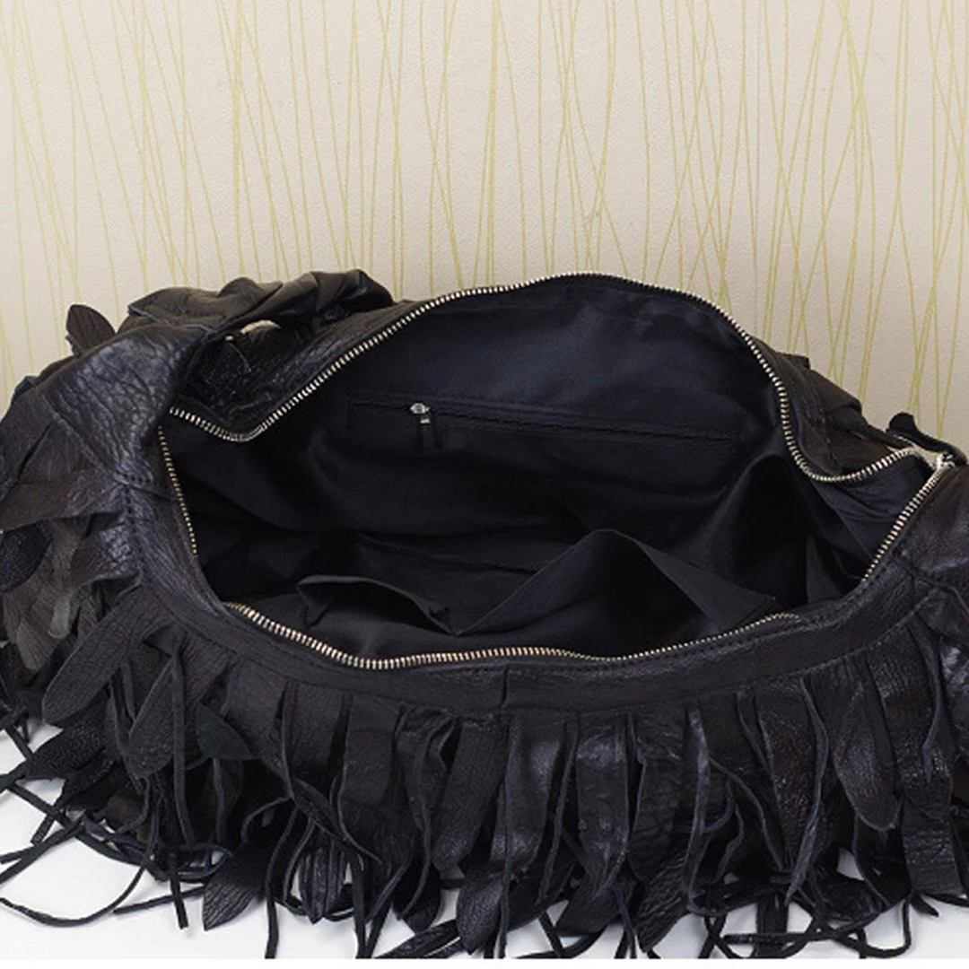 Внутри имеется большое отделение на молнии, прорезной карман на замочке и два открытых накладных кармашка. Сумка, безусловно, акцентная, классно дополнит образы в стиле бохо или добавит изюминку нейтральным вещам.