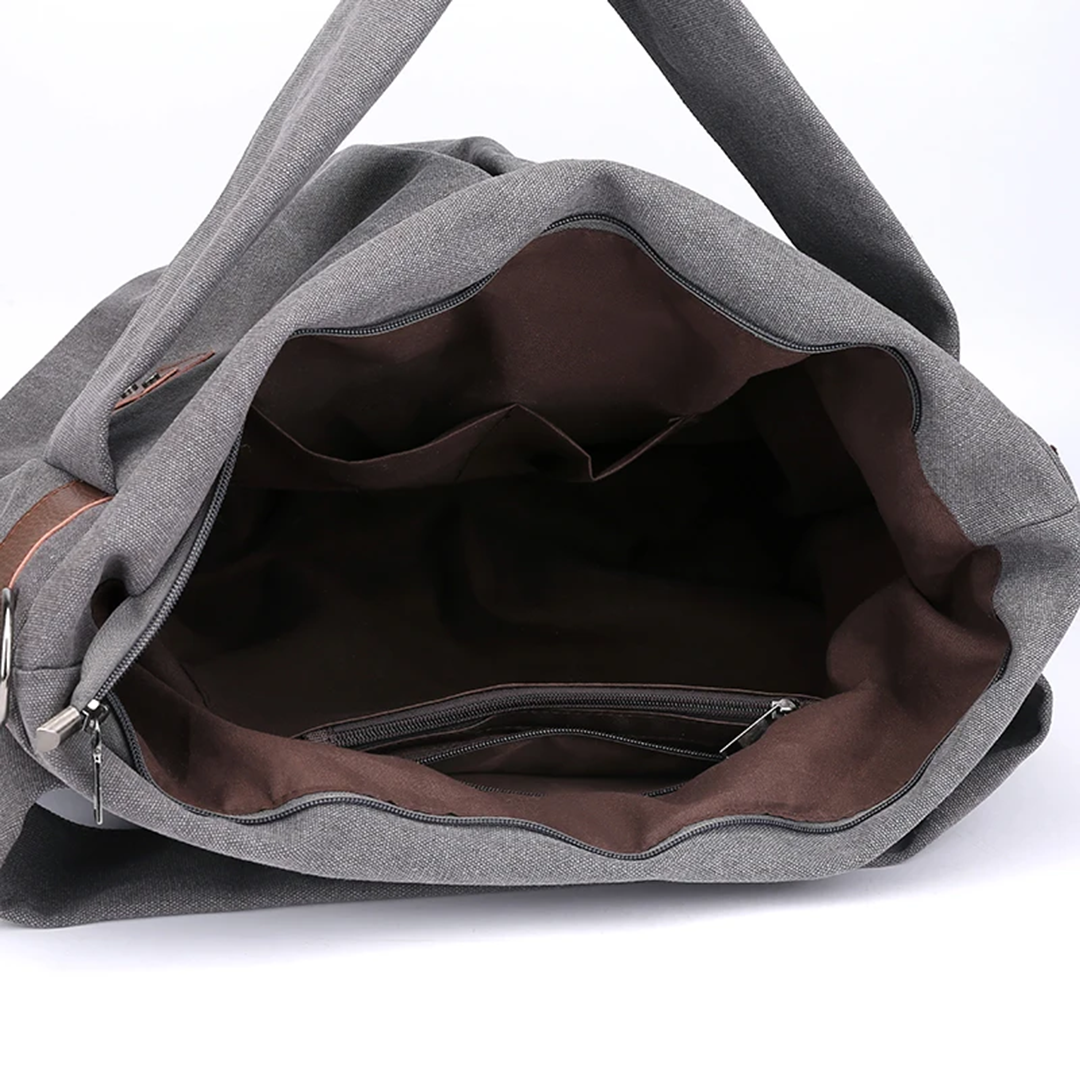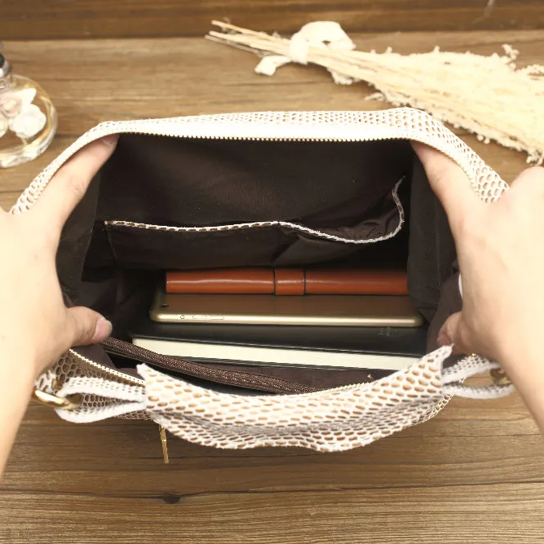 Благодаря широкой ручке её можно носить на плече или перекидывать, чтобы освободить руки. Внутри одно отделение для крупных вещей, прорезной карман на молнии и открытый накладной кармашек для телефона или документов.