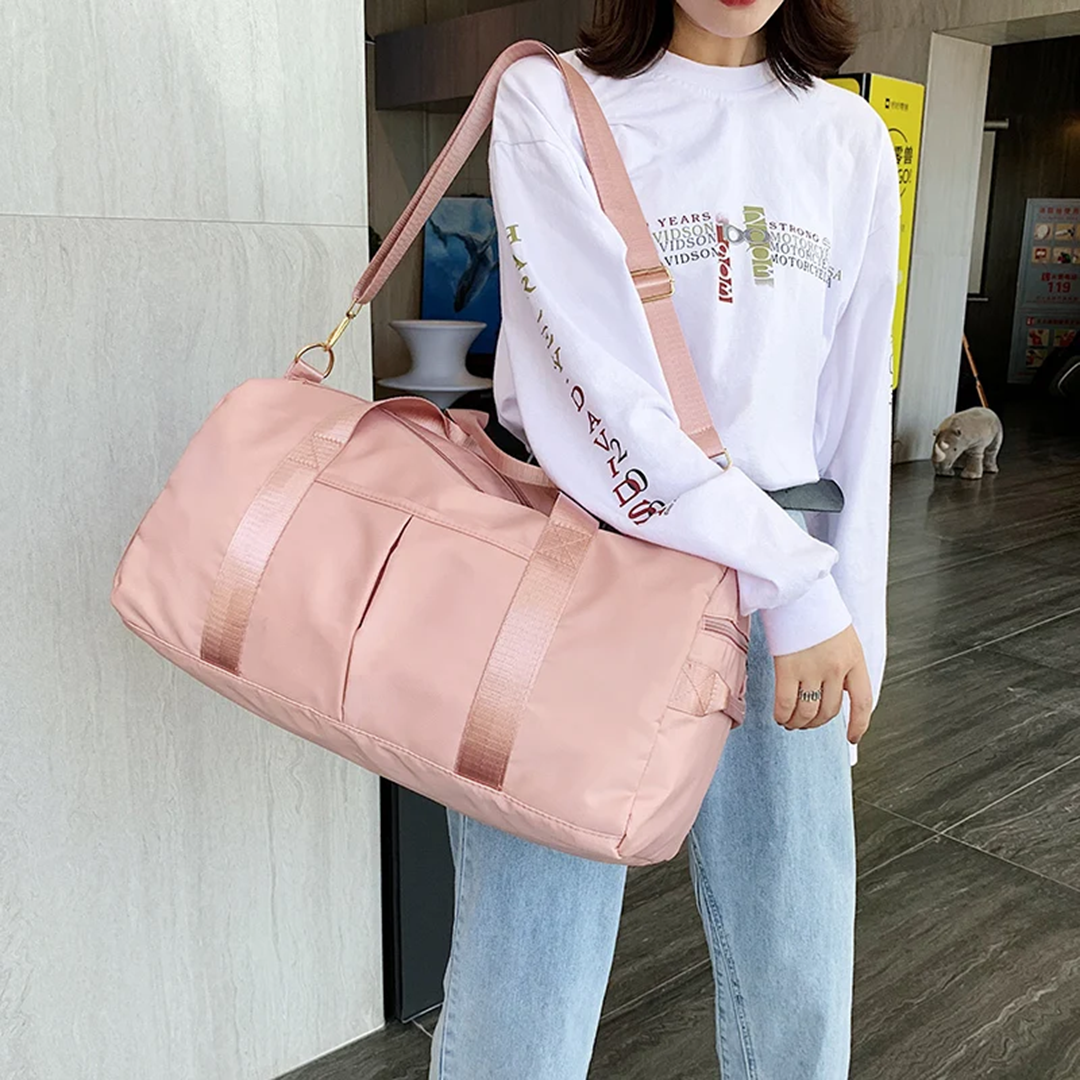 Её можно носить за короткие ручки или повесить на плечо. В вашем распоряжении два отделения на молнии, открытый накладной кармашек для телефона или внешнего аккумулятора и главная фишка — специальный отсек для обуви. Берём как на тренировку, так и в путешествия — сумку можно зафиксировать на чемодане через сквозной отсек.