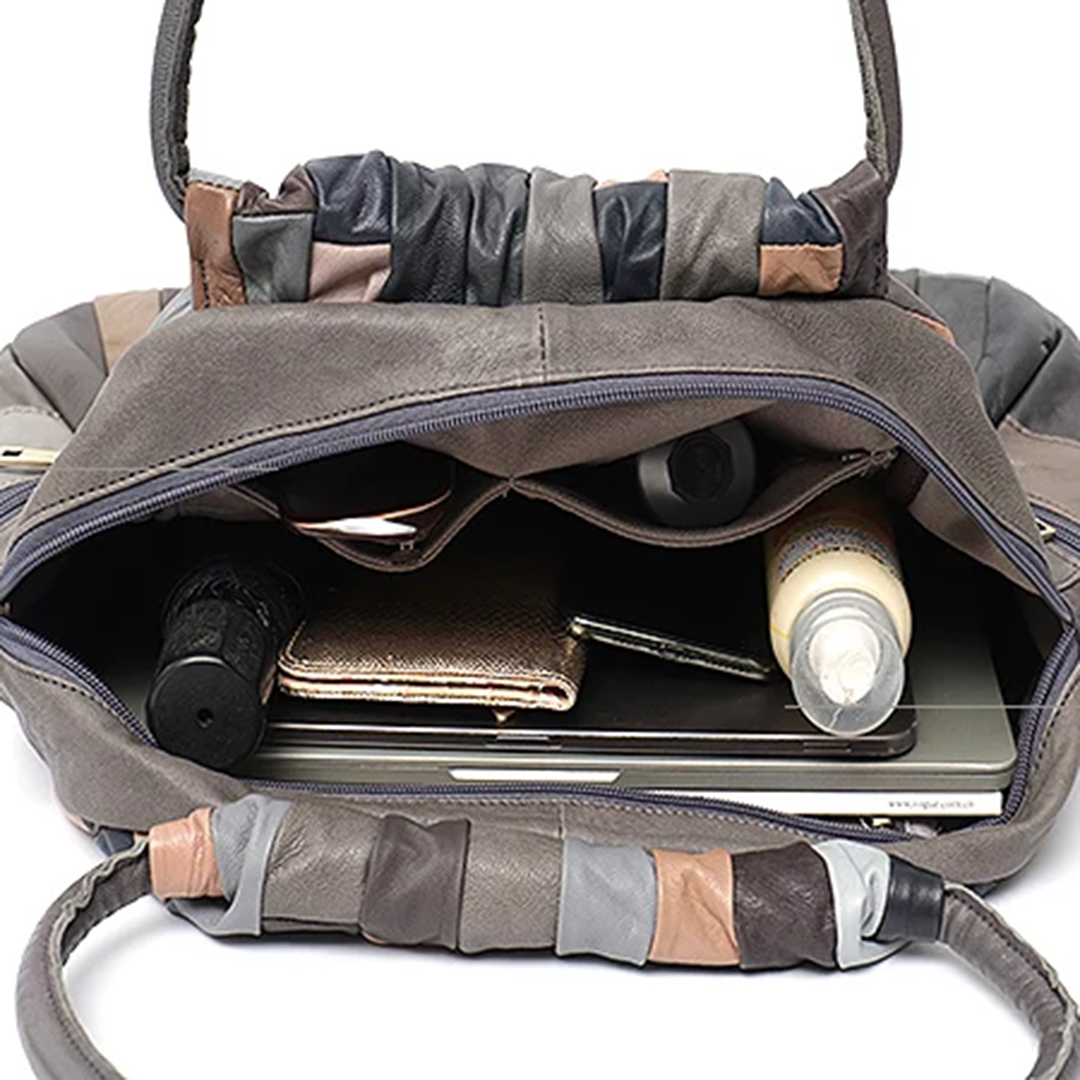 Модель с двумя короткими ручками и одной регулируемой длинной из ткани. Снаружи — большой прорезной карман на замочке, внутри — перегородка на молнии и ещё три небольших кармашка. Идеальный вариант на повседневку.