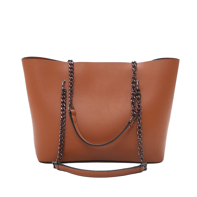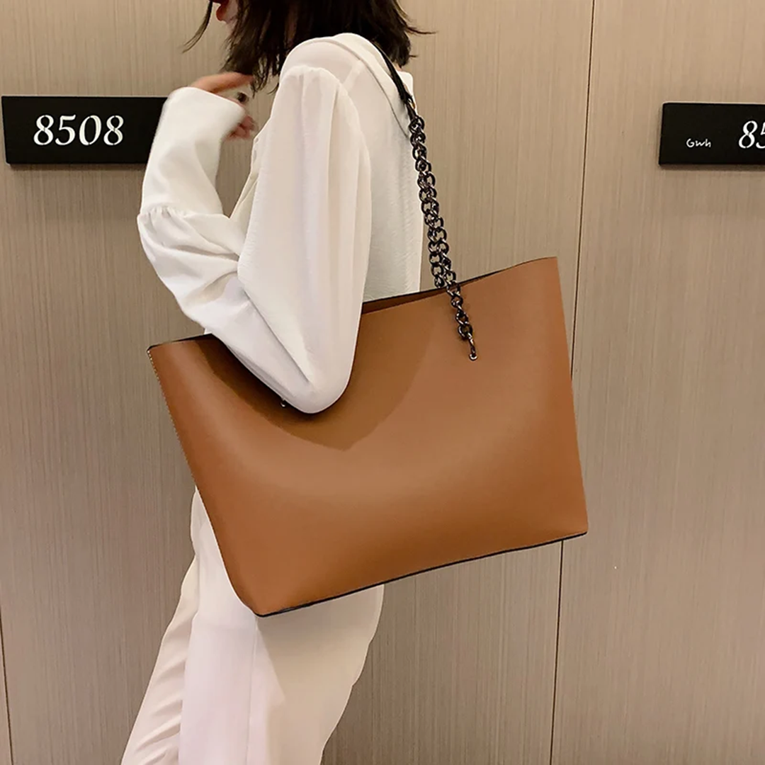 Сумка-трапеция с устойчивым дном (удобно носить ноутбук) и двумя короткими ручками на цепочке. Внутри карман-перегородка на молнии, прорезной карман и два открытых накладных. Сочетаем с джинсами, брюками и цветными оверсайз-свитерами.