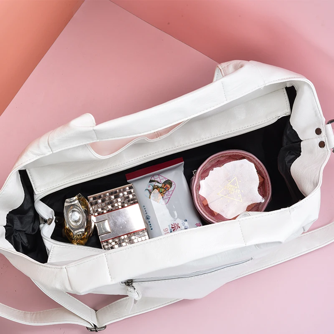 Сумка на плечо с двумя короткими и двумя длинными ручками. Мелкие загрязнения легко убрать влажной тряпочкой. Внутри прорезной карман на молнии и два открытых накладных кармашка для телефона, кошелька и зеркала.
