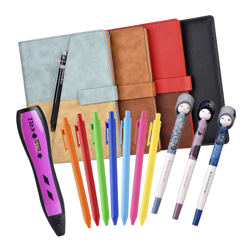 Однотонные блокноты с плотными страницами и обложками в красивых чистых цветах. Однотонные ручки — можно купить сразу большую коробку. Всё практично и со вкусом.