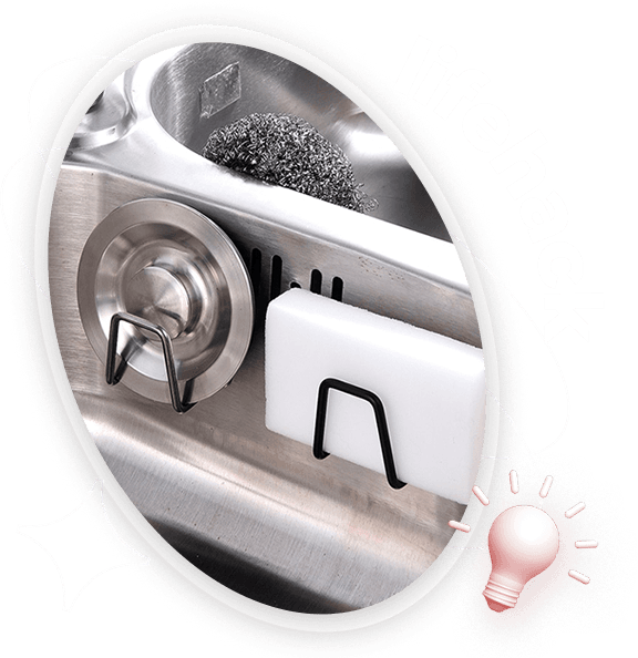 Держатель для губки. Его приклеивают с внутренней стороны раковины. Он выглядит крайне минималистично, вода стекает внутрь, а губка успевает быстро высохнуть. Держится очень крепко и не боится ни воды, ни чистящих средств.