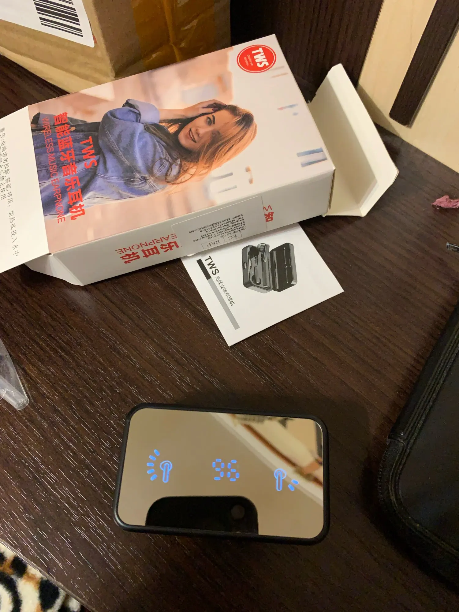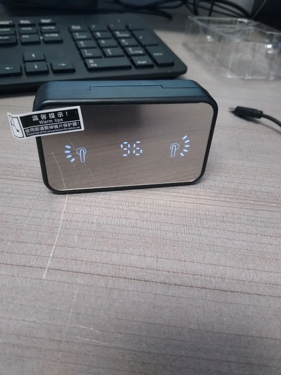 Charging method: Put the earphones in the charging compartment and close the cover, the earphones will charge automatically. The earphones will display a red light during charging, and the external display will light up to show the charging information when the cover is closed, and it will automatically go out after being fully charged.