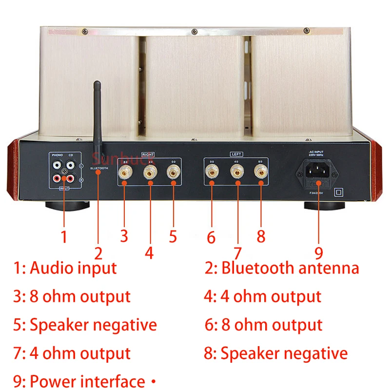 1: Аудиовход / 2: антенна Bluetooth / 3: выход 8 Ом / 4: выход 4 Ом / 5: отрицательный динамик / 6: выход 8 Ом / 7: выход 4 Ом / 8: отрицательный динамик / 9: интерфейс питания ·